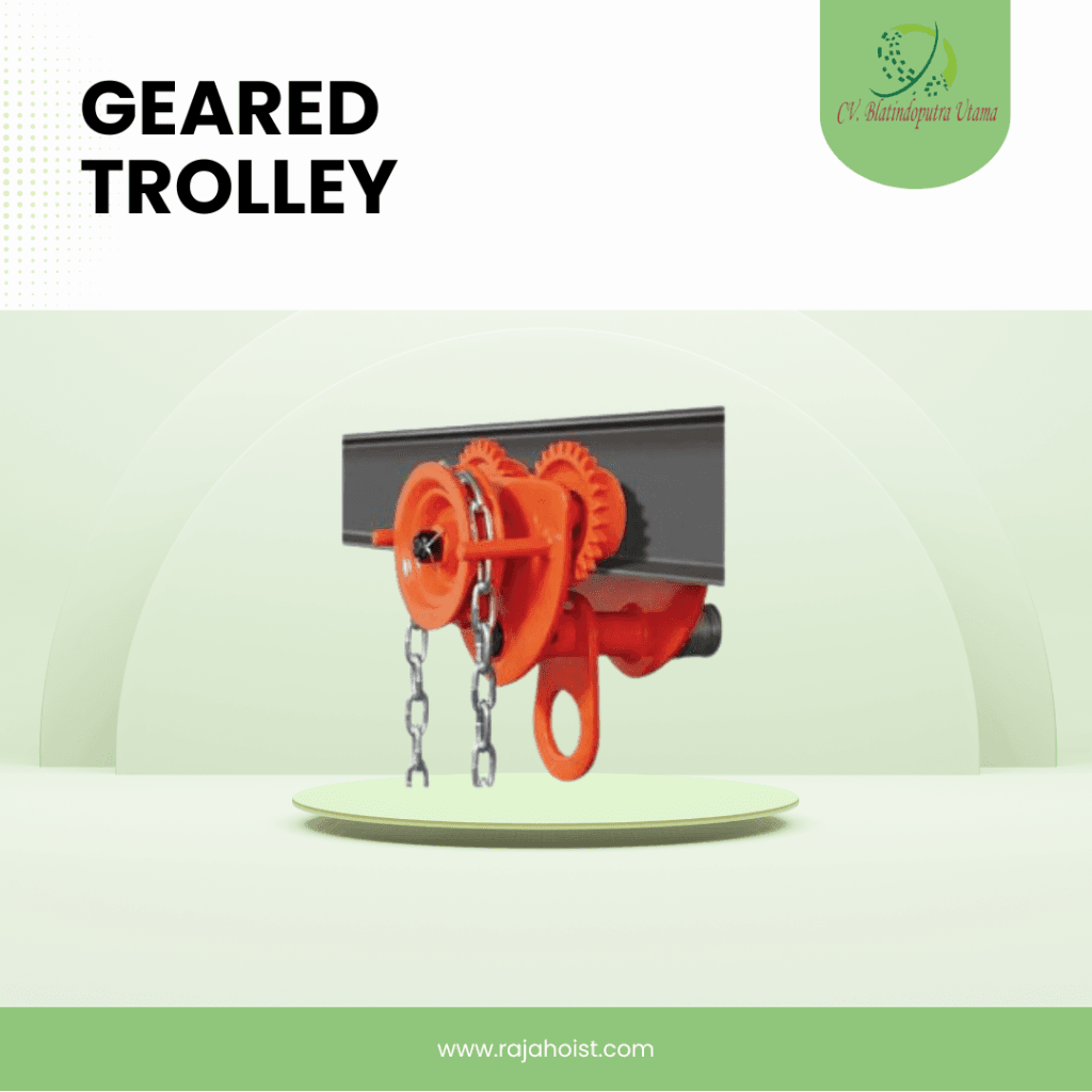 Selain electric trolley dan plain trolley, terdapat satu lagi pilihan trolley yang patut menjadi bahan pertimbangan yaitu geared trolley. Geared Trolley termasuk jenis trolley manual yang dioperasikan secara manual. Jenis alat yang satu ini dapat menjadi pilihan bagi para pelaku industri yag tidak dapat menggunakan electric trolley karena berbagai alasan mulai dari biaya operasional yang terbatas, daya listrik yang kurang mencukupi, ataupun berbagai alasan lainnya.